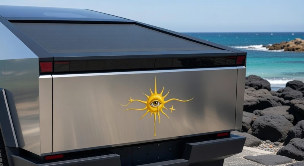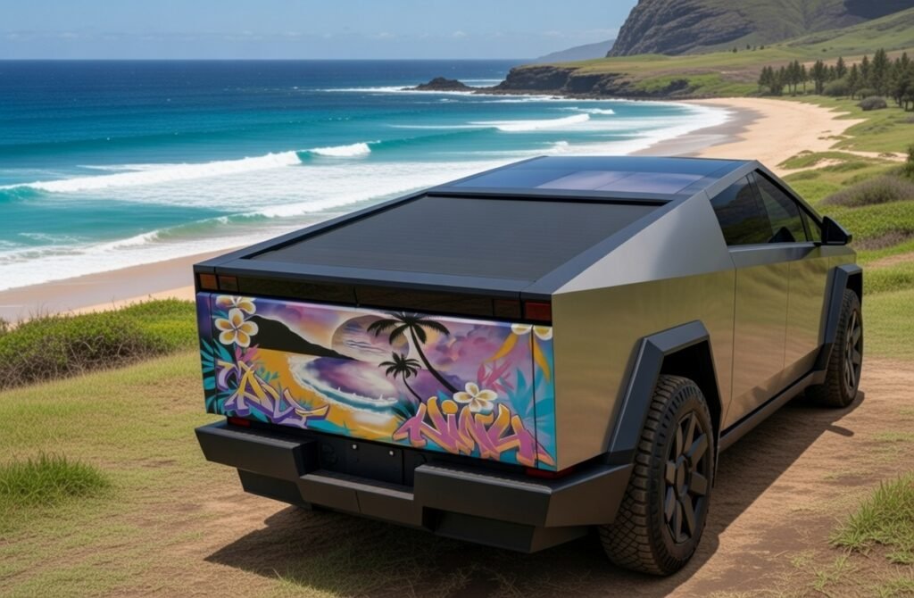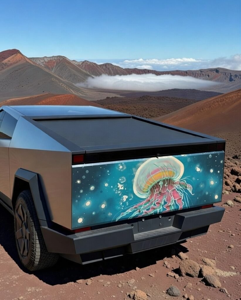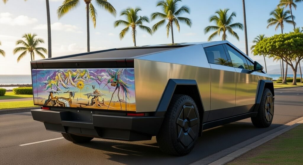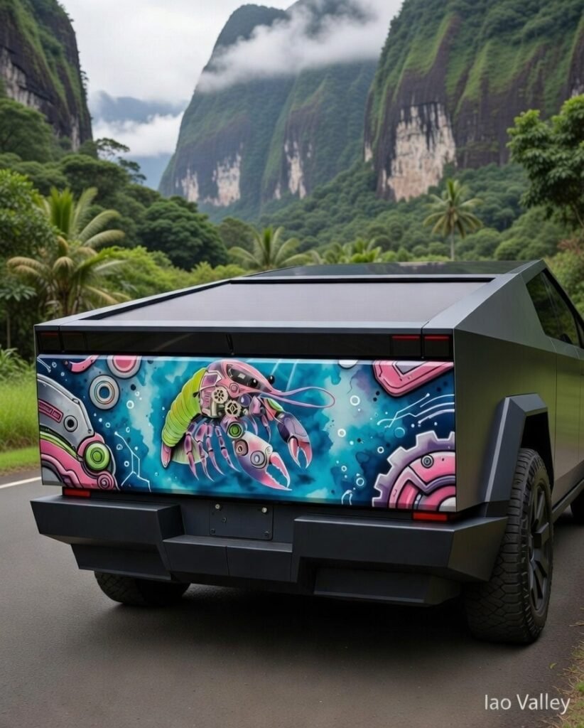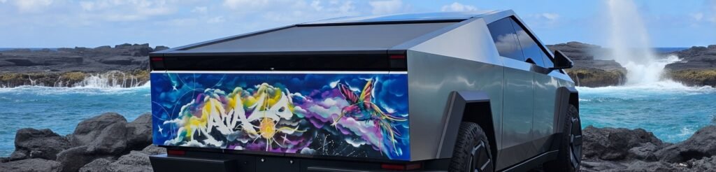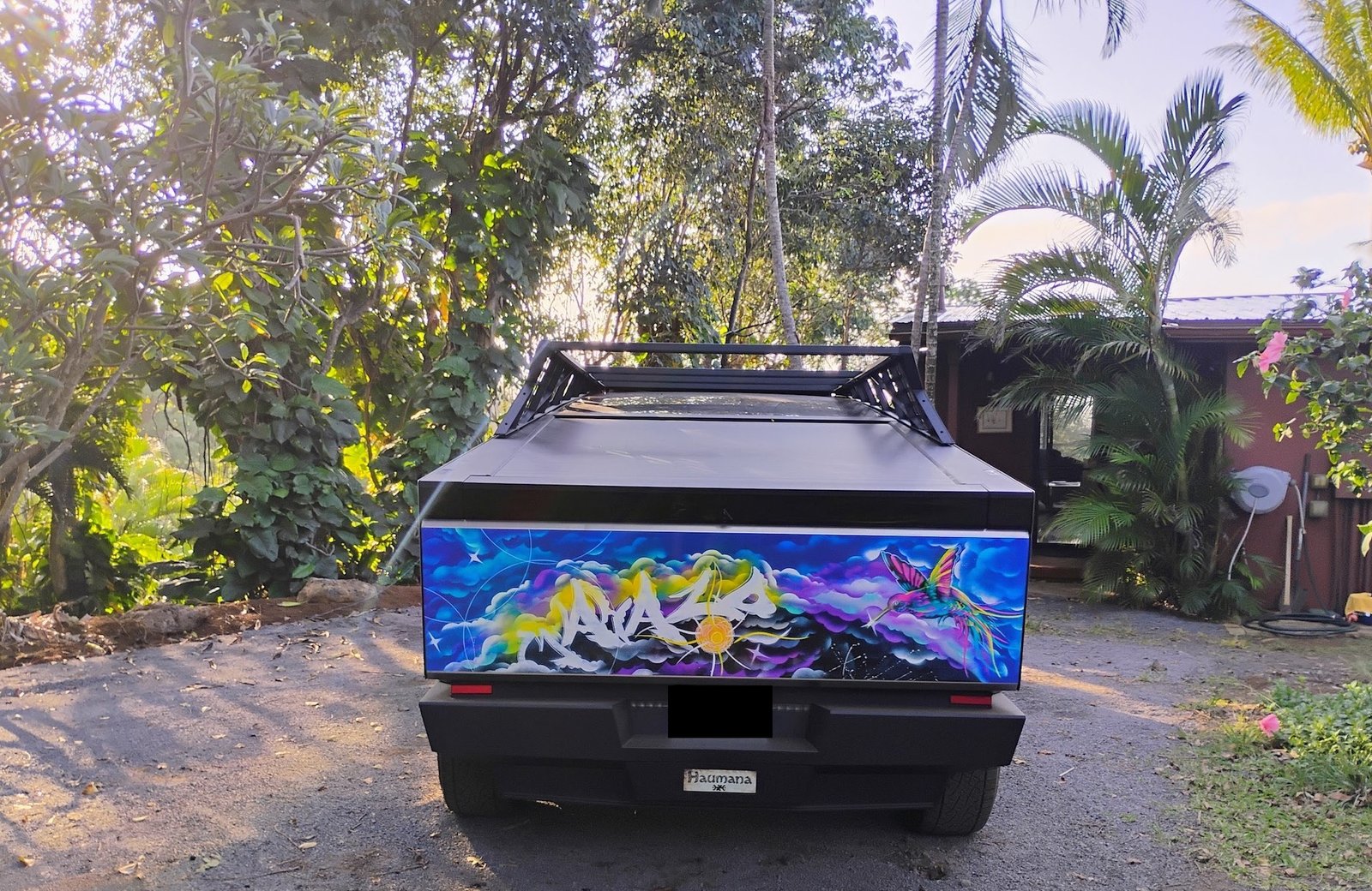 I saw Juan’s artwork and was struck by it’s beauty and thought, ‘One day….”. After picking up my Cybertruck we collaborated on a few ideas and ultimately I asked him to paint what was in his heart, and so, Mahalo Bird was born!