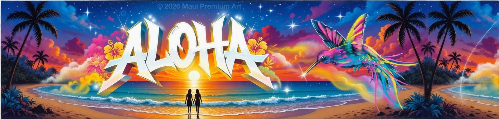 This radiant panoramic masterpiece captures the true essence of Aloha – the Hawaiian way of life rooted in unconditional love, compassion, and an open heart. Bold, glowing 3D lettering spells “ALOHA” in luminous metallic gold against a psychedelic tropical sunset bursting with pinks, oranges, purples, and electric blues. A majestic, iridescent hummingbird (symbolizing joy, energy, and the free spirit) soars with rainbow wings, trailing vibrant light as it drinks from the warmth of the setting sun. Silhouetted palm trees sway gently, hibiscus blooms explode in vivid color, and a starry night sky sparkles above. At the water’s edge, a loving couple stands hand-in-hand on the sandy shore, gazing into the golden horizon where ocean meets sky – embodying connection, romance, and heartfelt presence. Perfect for infusing any space with island magic, positive energy, and the timeless spirit of love.