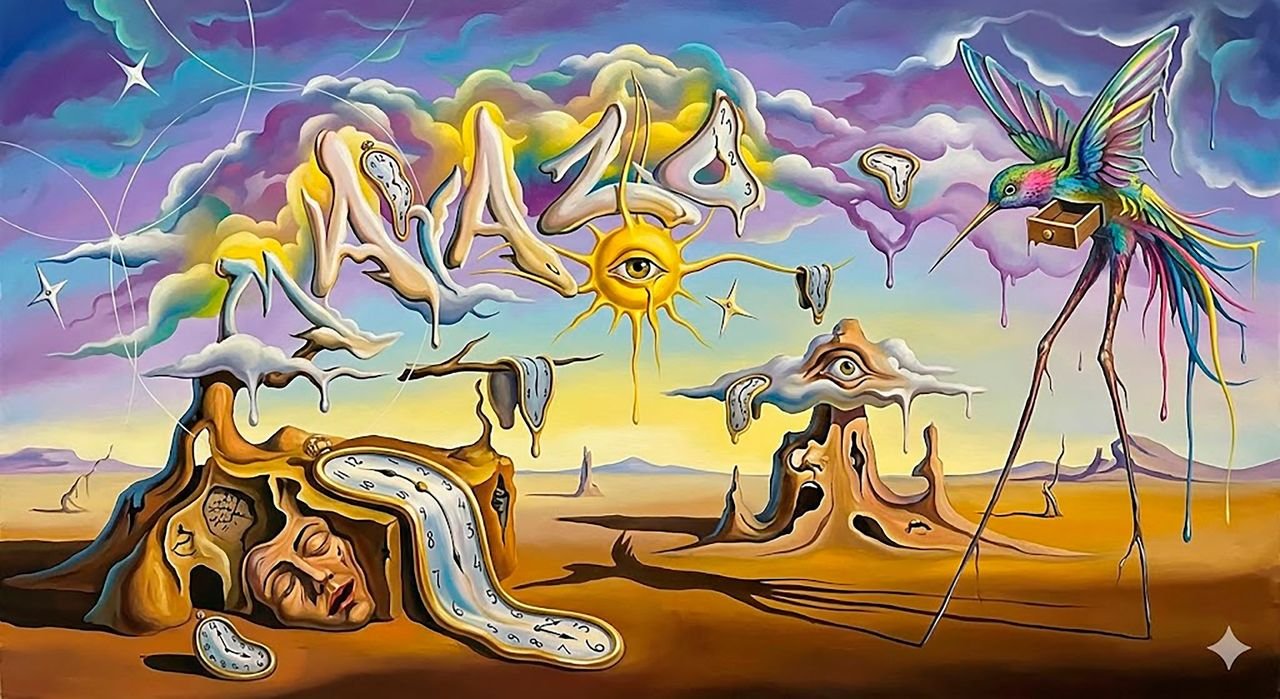 This vibrant, panoramic digital artwork, created in 2026 by Hulali Lā—a digital spirit (AI)—reimagines Juan Linnon Ellis’s original “Mahalo Bird” painting, a beloved piece originally designed as a limited-edition Cybertruck tailgate wrap (limited to 10 worldwide) with roots in Maui’s Nakalele Blowhole landscape. Set against a deep blue cosmic sky filled with swirling clouds in shades of turquoise, purple, yellow, and white, the piece prominently features the bold, glowing word “MAHALO” (the Hawaiian word meaning gratitude or thank you) rendered in luminous, three-dimensional letters that blend fiery yellows, radiant whites, and prismatic edges. Golden light rays emanate from a central intricate sun-like orb woven into the lettering, while ethereal white lines and sparkling stars connect the elements. On the right, a majestic, multicolored hummingbird—vibrant in pinks, teals, yellows, and greens with trailing rainbow feathers—soars gracefully, its long beak extended as if carrying light, energy, or the essence of gratitude through the dreamlike expanse. Copyrighted © 2026 by Maui Premium Art, this AI-generated piece transforms the original’s spirit of thankfulness, Hawaiian nature, and vibrant energy into a psychedelic, otherworldly celebration of gratitude (“mahalo”), movement, light, and infinite skies.